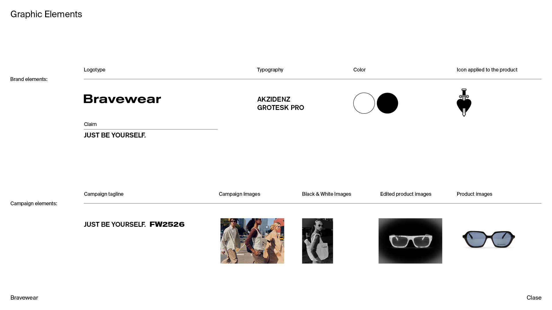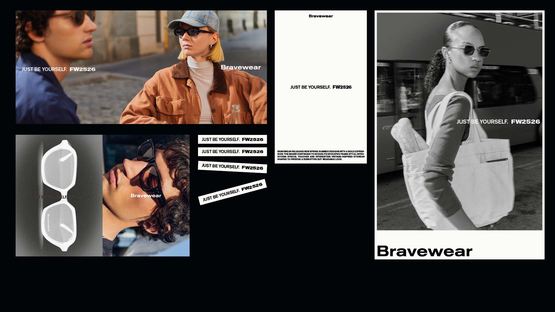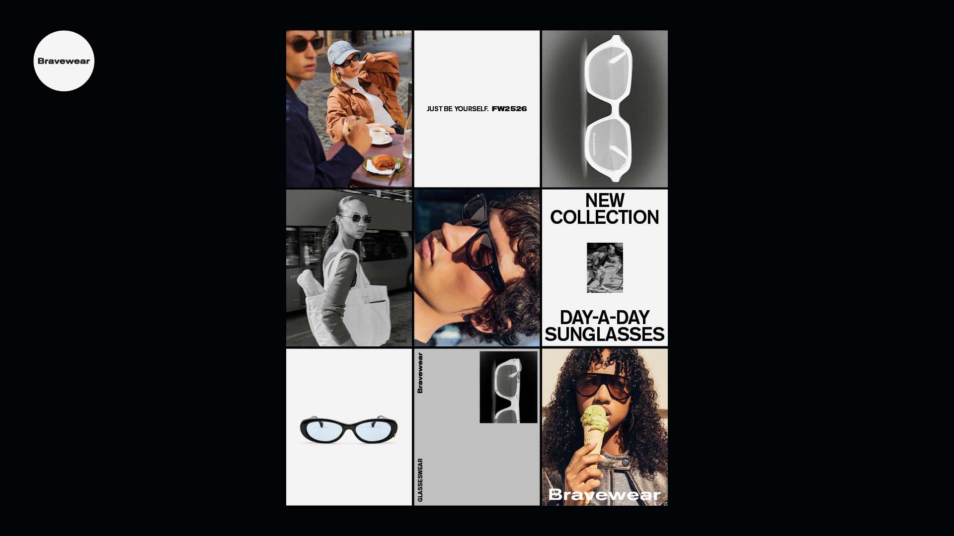 Brand identity for Bravewear, a bold eyewear label built on confidence and self-expression. We worked on the naming, branding, and tone of voice to shape a fearless, modern attitude. The name blends Brave and Wear, turning the act of wearing eyewear into a statement of individuality and strength.